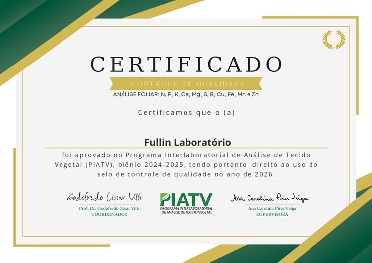 Para as Análises Agronômicas a FULLIN é integrante dos Programas Interlaboratoriais de proficiência, coordenados pela USP-ESALQ, Instituto Agronômico de Campinas - IAC e EMBRAPA.